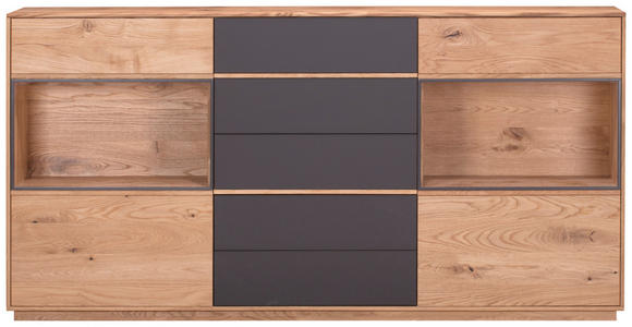 Natürlichem Wohnen verleiht WALDWELT einen zeitgemäßen Touch: Dieses ca. 177 cm breite Sideboard aus Eiche massiv mit Beleuchtung ist grifflos und fügt sich wie ein Kunstwerk in Ihr Wohnzimmer ein. Die Kombination aus geöltem Echtholz, gläsernen Vitrineneinsätzen und Satinglas in Grau zeigt, wie elegant Massivholzmöbel sein können.